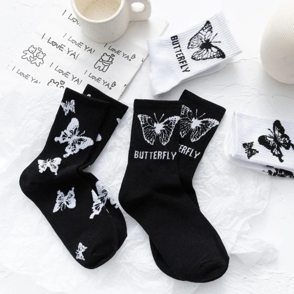 4 Çift Sevimli siyah beyaz Desenli Kadın kolej kelebekli beyaz Çorap