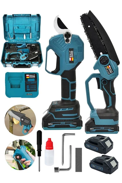 WaltMann Çift Bataryalı Extra Güçlü Şarjlı Dal Budama Ağaç Odun Kesme Mavi