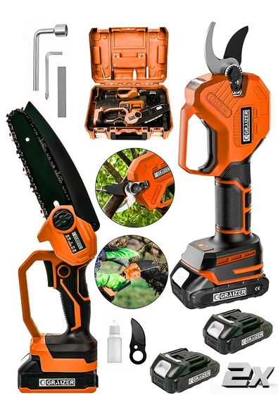 Graizer Profesyonel 2'li Set 18v Çift Akülü Bağ Makası Ve Budama Testeresi Makinesi Turuncu