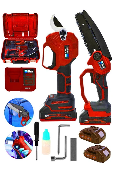 WaltMann Çift Bataryalı Extra Güçlü Şarjlı Dal Budama Ağaç Odun Kesme Kırmızı