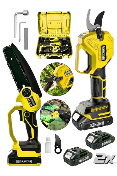Graizer Profesyonel 2'li Set 18v Çift Akülü Bağ Makası Ve Budama Testeresi Makinesi Sarı