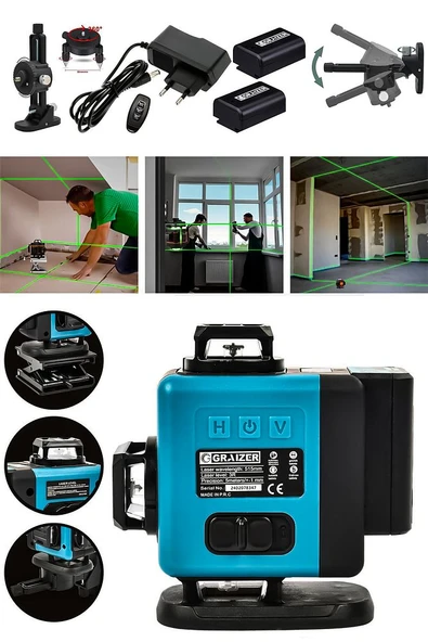Graizer 360° 12 Köşe Otomatik Hizalamalı Yeşil Çizgili Su Terazili Lazer Metre Hizalama Mavi