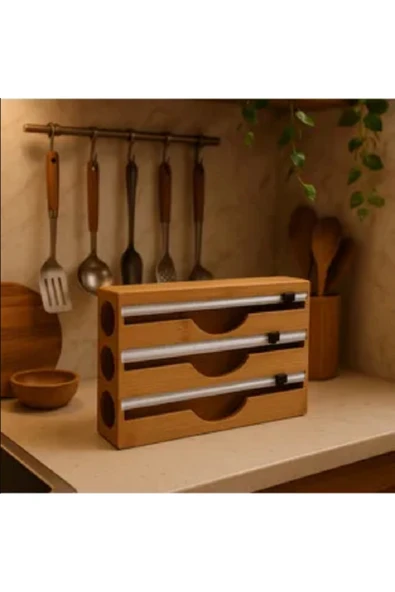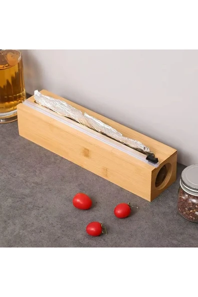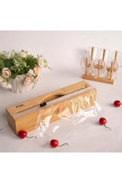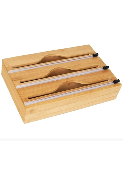 Bundeba 3 Bölmeli Alimunyum Folyo Streç Kesici Folyoluk Streçlik Organizer %100 Doğal Bambu