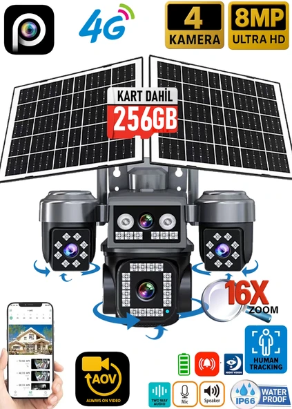 Ventus Z7PLUS 256GB 8MP 4 Kameralı 4G Çift Solar Panel 16X Zoom Dual Batarya HiEasy AOV (Sürekli Kayıt) Gece Görüş Çift Yönlü Ses HiEasy Türkçe