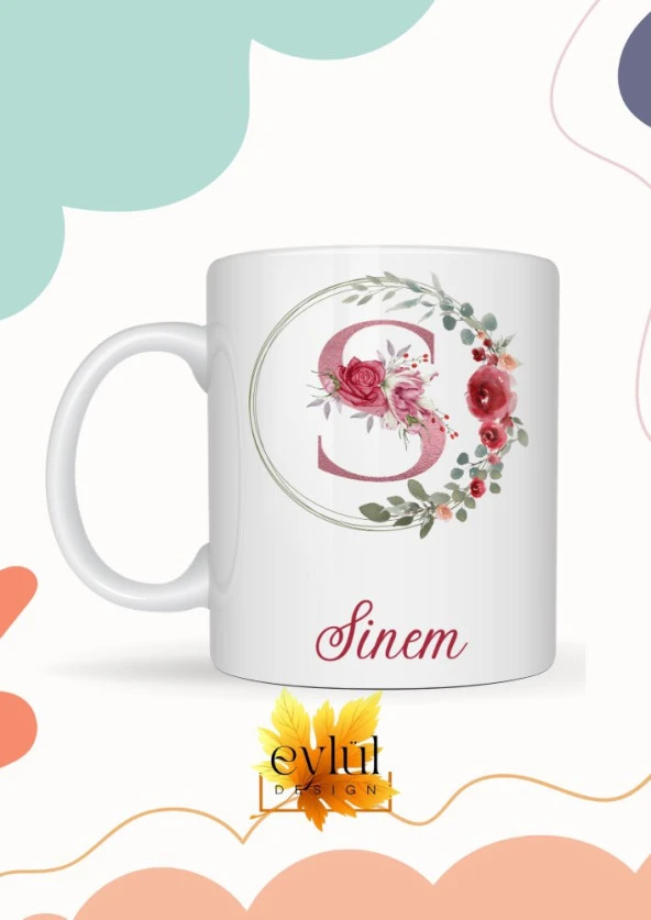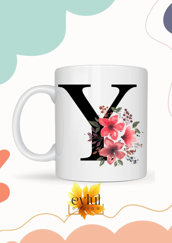 Y Harfi Pembe Çiçekli Baskılı Özel Tasarım Renkli Baskılı Kupa Bardak Doğum Günü Hediyesi