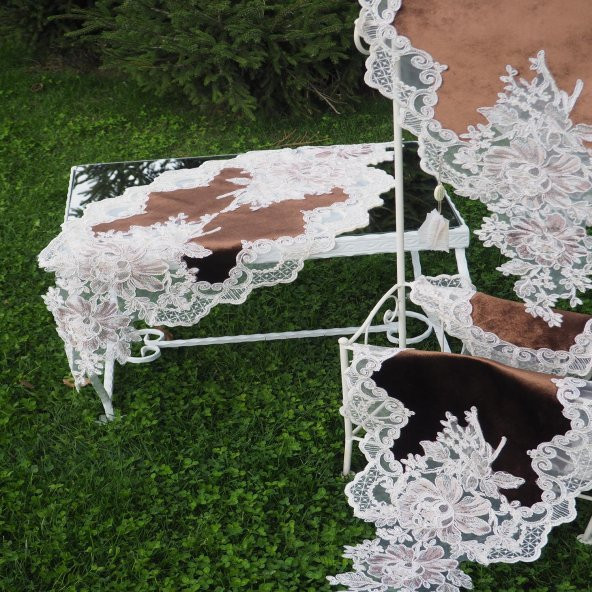 Finezza Beste Aplikeli Güpürlü Kadife Kahve Salon Takımı 5 Parça - 476