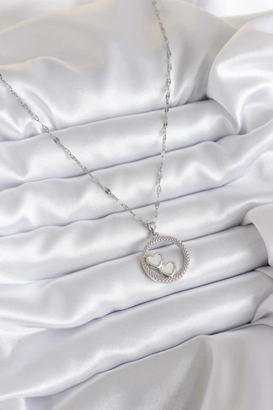 316L Çelik Zincir Gümüş Renk İşleme Detay Halka Kalp Model Kadın Kolye