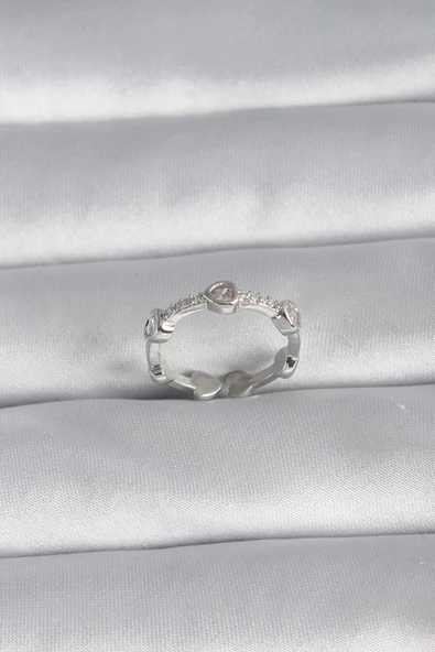 Pirinç Gümüş Renk Pembe Zirkon Taş Kalp Charm Model Kadın Yüzük