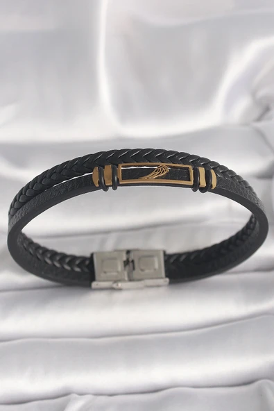 Gold Renk Metal Ağaçlı Tasarım Siyah Renk Deri Erkek Bileklik