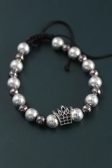 Doğal Taş Kral Tacı Model Gümüş Ve Füme Renk Asansörlü Erkek Bileklik