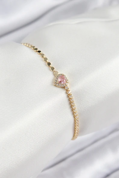 Vip Seri Pirinç Gold Renk Pembe Zirkon Taşlı Kalp Tasarımlı Bileklik