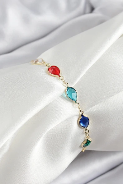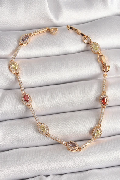 Pirinç Gold Renk Renkli Damla Zirkon Taşlı Kadın Bileklik