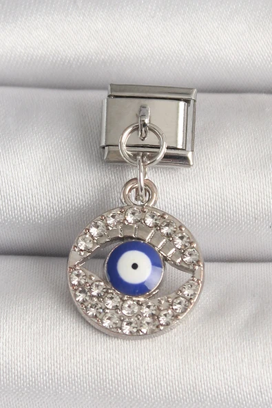 316L Çelik Gümüş Renk Zirkon Taşlı Göz Model Nazar Boncuk Detay Nomination Charm