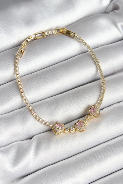 Pirinç Sıralı Pembe Kalp Figürlü Zirkon Taşlı Gold Renk Kadın Bileklik