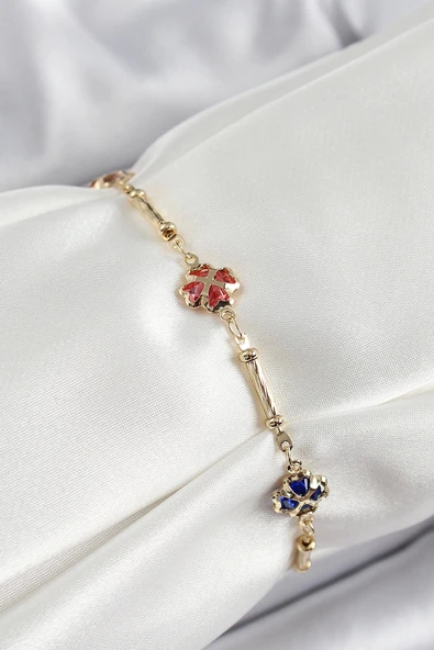 Pirinç Gold Renk Karışık Renk Yonca Zirkon Taşlı Kadın Bileklik
