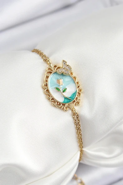 316L Çelik Zincir Mineli Sanatsal Portre Zirkon Taşlı Kelebek Detaylı Çiçek Model Gold Renk Kadın Bileklik