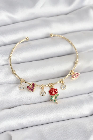 Gül Charmlı Gold Renk Pirinç Kadın Bileklik