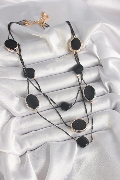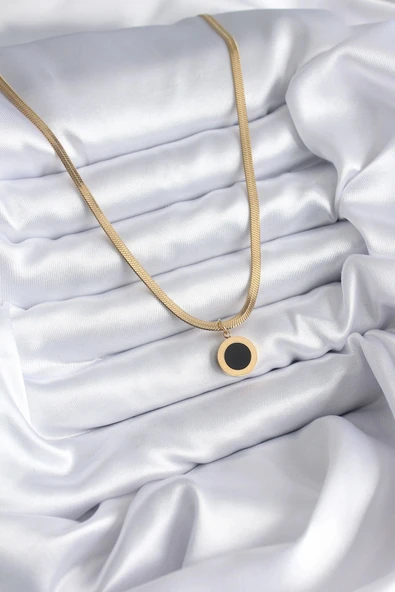 Pirinç Gold Renk Siyah Renk Oval Siyah Küp Detay Kadın Kolye