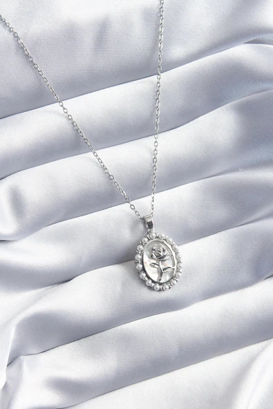 316L Çelik Gümüş Renk Gül Model İnci Detay Kadın Kolye