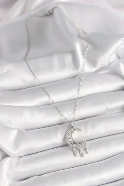 316L Çelik Gümüş Renk Zincir Beyaz Mineli Hilal İşlemeli Madalyon Model Kadın Kolye