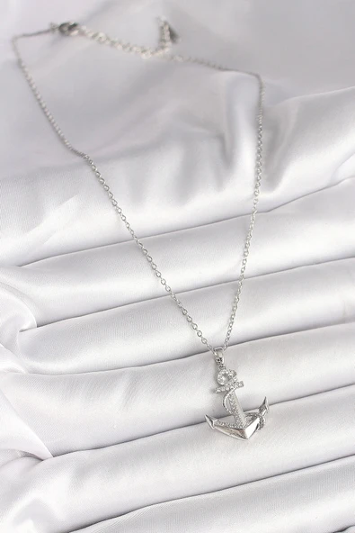 316L Çelik Gümüş Renk Zincir Zirkon Taş Detaylı Çapa Model Kadın Kolye