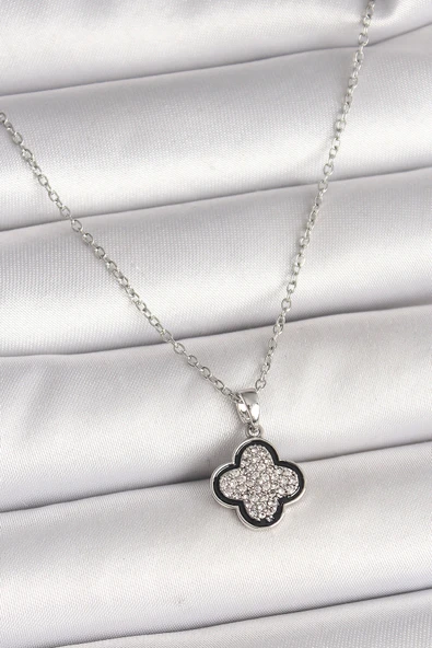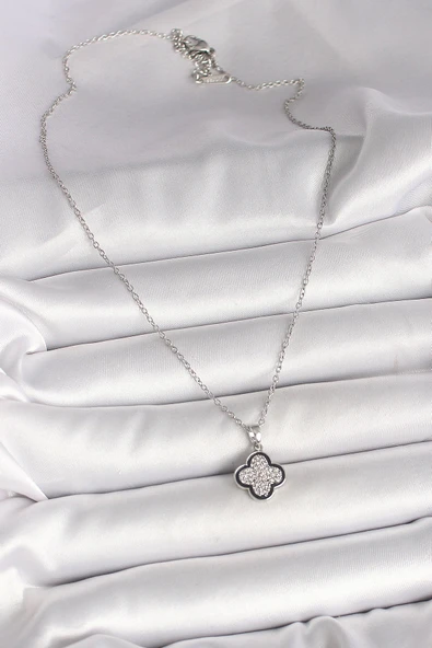 316L Çelik Gümüş Renk Zincir Zirkon Taşlı Yonca Model Kadın Kolye