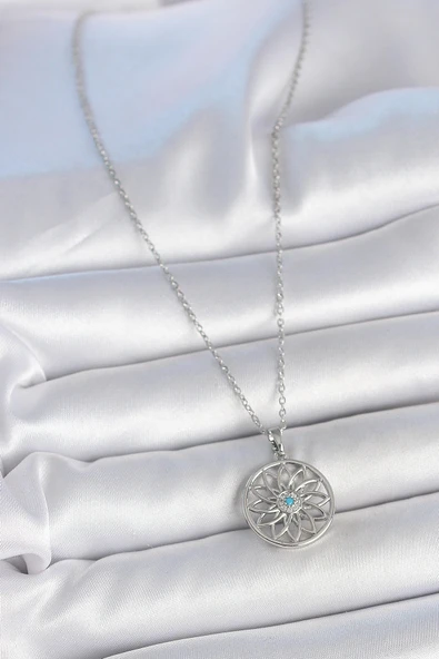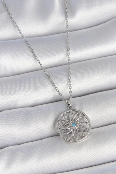 316L Çelik Gümüş Renk Zincir Mavi Taşlı Lotus Model Kadın Kolye