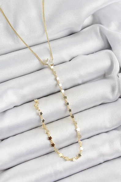 Pirinç Zirkon Taşlı Sıralı Yıldız Figürlü Y Model Gold Renk Kadın Kolye