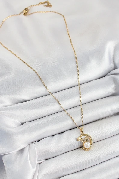 316L Çelik İnci Detaylı Hilal Tavşan Model Gold Renk Kadın Kolye