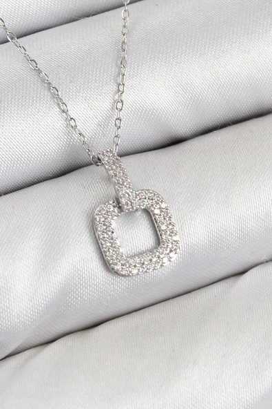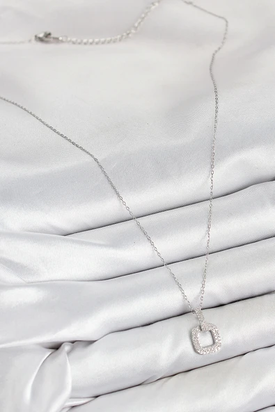 Pirinç Zirkon Taşlı Kare Model Gümüş Renk Kadın Kolye