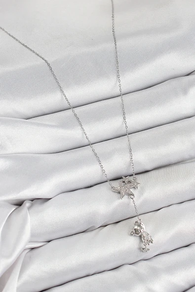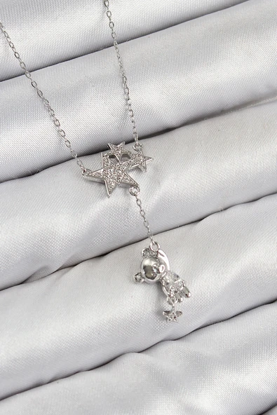 Pirinç Zirkon Taşlı Sallantılı Ayıcıklı Yıldız Model Gümüş Renk Kadın Kolye
