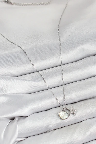 Pirinç Zirkon Taşlı İstiridye Ve Deniz Yıldızı Model Gümüş Renk Kadın Kolye