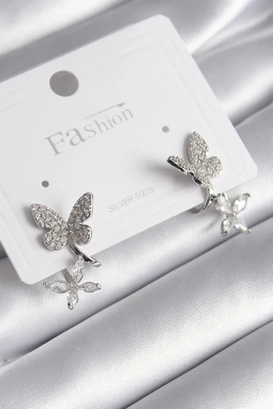 Pirinç Gümüş Renk Zirkon Taşlı Kelebek Model Kadın Küpe