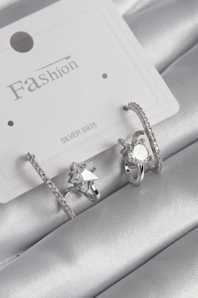 Pirinç Zİrkon Taşlı Dikdörtgen Model Gümüş Renk 3'lü Çift Kadın Küpe