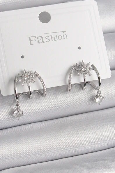 Pirinç Gümüş Renk Zirkon Taşlı Çiçek Figür Sallantı Detay Kadın Küpe