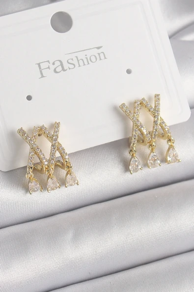 Pirinç Gold Renk Zirkon Taşlı X Model Sallantı Detay Kadın Küpe