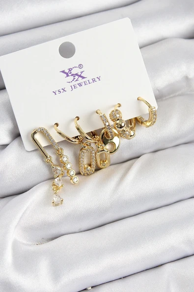 Pirinç Zİrkon Taşlı Halka Model Gold Renk 3'lü Kadın Küpe
