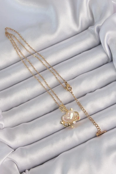 316L Çelik Zincir Altın Renk Sedefli Kalp Figür Zirkon Taşlı Gezegen Kolye