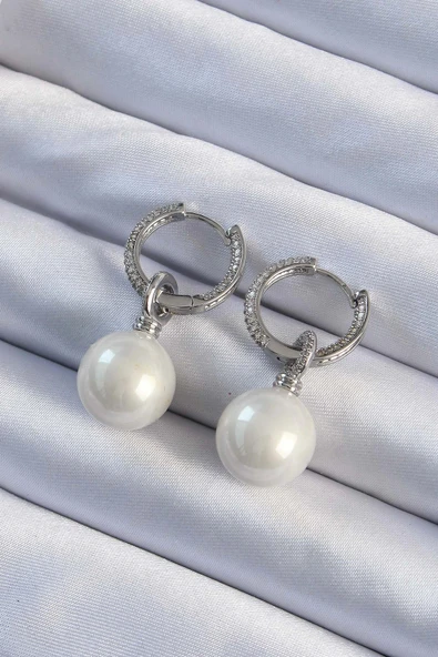 Pirinç Gümüş Renk Zirkon Taş Kaplama İnci Tasarımlı Kadın Küpe