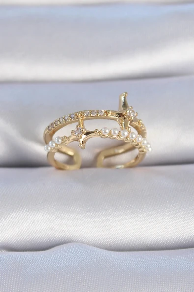 Pirinç Gold Renk Zirkon Taşlı İnci Detay Kutup Yıldızı Model Kadın Yüzük