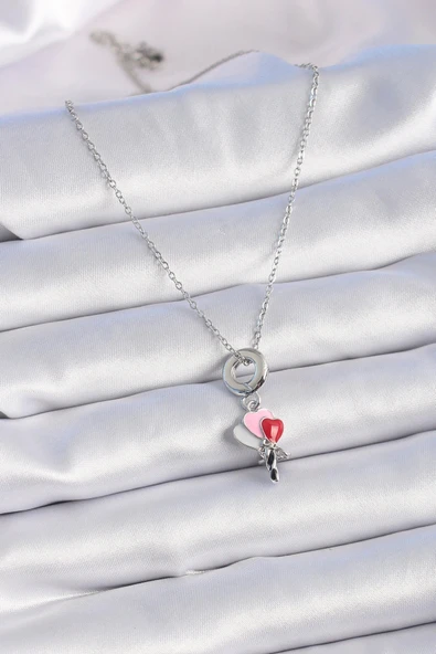 316L Çelik Gümüş Renk Renkli Kalp Figür Charm Model Kadın Kolye