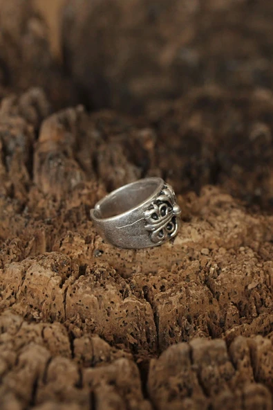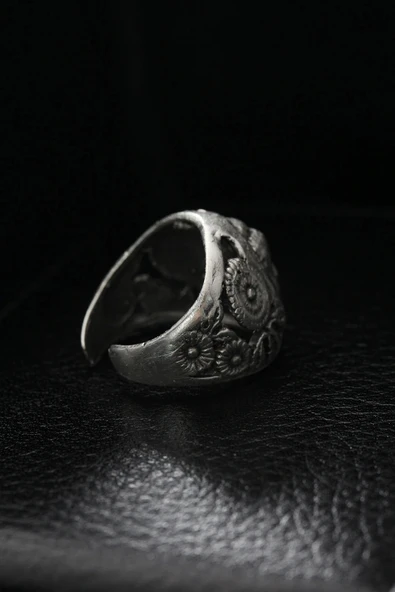 Kuru Kafa Tasarımlı Eskitme Gümüş Desenli Ayarlamalı Model Erkek Yüzük