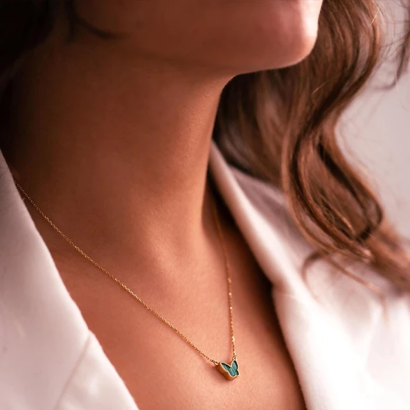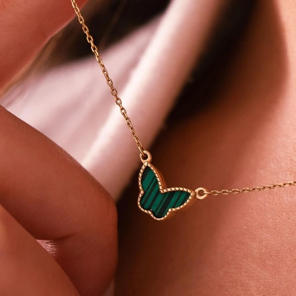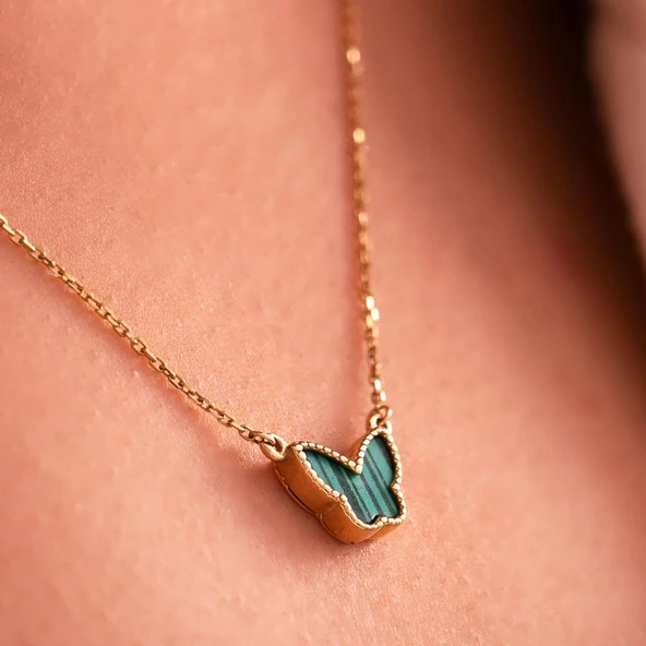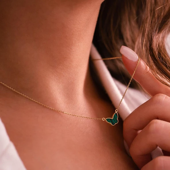 14 Ayar Altın Yeşil Mineli Kelebek Kolye