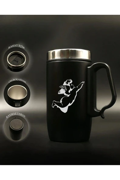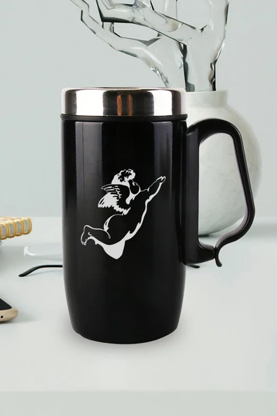 Nesnel Gift Siyah Çelik Kulplu Bardak Termos - Melek Motifli