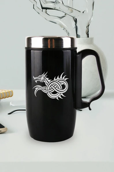 Nesnel Gift Siyah Çelik Kulplu Bardak Termos - Kendini Yiyen Ejderha Motifli