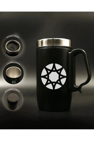 Nesnel Gift Siyah Çelik Kulplu Bardak Termos - Antik Sembol Motifli