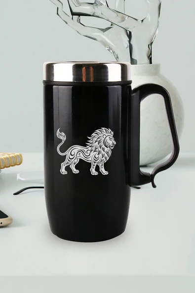Nesnel Gift Siyah Çelik Kulplu Bardak Termos - İllistrasyon Aslan Motifli