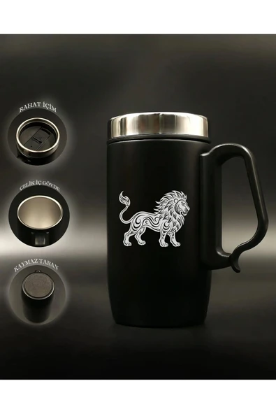 Nesnel Gift Siyah Çelik Kulplu Bardak Termos - Aslan Kafası Motifli