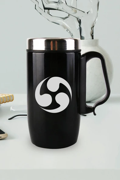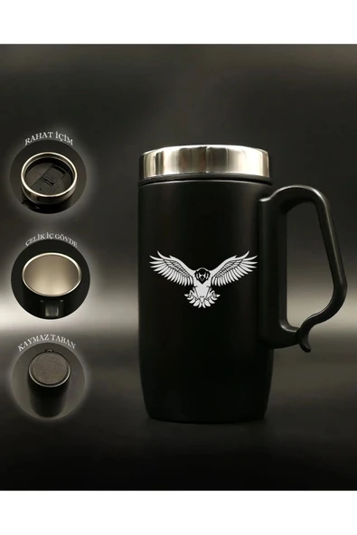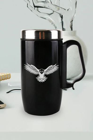 Nesnel Gift Siyah Çelik Kulplu Bardak Termos - Kartal Kafası Motifli