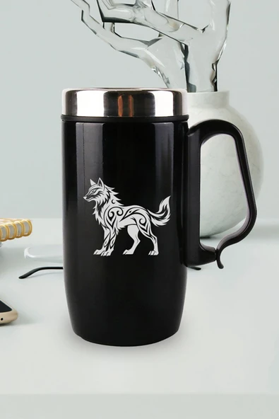 Nesnel Gift Siyah Çelik Kulplu Bardak Termos - İllistrayon Kurt Motifli